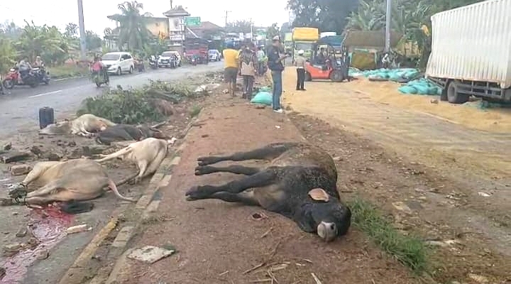 Truk Pengangkut Sapi Seruduk Angkutan Padi, Puluhan Ekor Terkapar